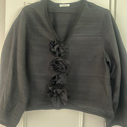 Elegant, brunfärgad blus med en unik textur. Blusen har en mandarin krage och en knappslå som sträcker sig en bit ner på framsidan. Långa ärmar med lätt puff vid axlarna ger en sofistikerad silhuett.