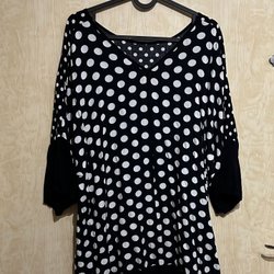 Svart och vit blus med långa ärmar. Blusen har en nyckelhålsöppning i nacken. Använd 2 gånger
