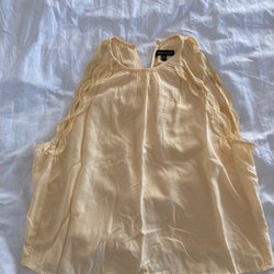 Gul och vit mönstrad blus med korta ärmar. Blusen har ett mönster av blad.