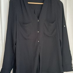 Svart långärmad blus med . Blusen har en knapp i nacken.