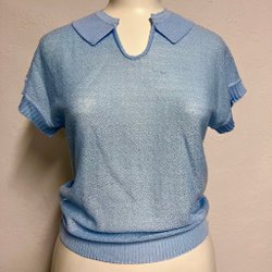 En ljust gul sidenblus med fantastisk glans, trekvartsärmar och bröstfickor med lock. Den är rundringad utan krage vilket ger den ett mer nedklätt intryck, mer som en tröja, samtidigt som materialet och fallet ger den ett välklätt uttryck.