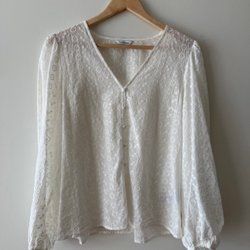 Vit blus med ett mönster i blått och en smockad halsringning. Blusen har 3/4 ärmar och ett dekorativt band med paisleymönster nedtill. Den går att bära offshoulder också och är superskön att ha på sig. Den är väl använd men har inga synliga hål eller fläckar.