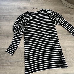 Ljusblus med vita ränder och broderade detaljer på ärmarna. Blusen har en öppen rygg med knytband.