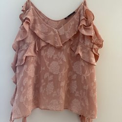 ZARA Blus chiffong med volanger runt hals, urringning, ärmar . använd 2 ggr . Användbar öppen elr stängd . St M .