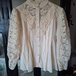 Elegant blus med spetsdetaljer och långa ärmar. Blusen har en v-formad halsringning med spetskant och ett genombrutet spetsmönster över hela plagget.
