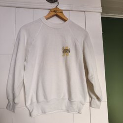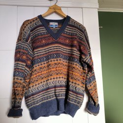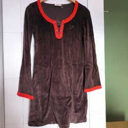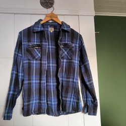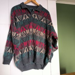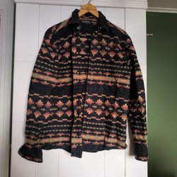 En grön och svart mönstrad blus med långa ärmar och dragkedja framtill. Blusen har en krage och ett prickigt mönster. Typ sammetsmaterial. Märkt L men mer som S.
