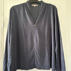 Mörkblå blus med långa ärmar och dekorativa detaljer vid halsen och axlarna. Blusen har en avslappnad passform och en V-ringning.