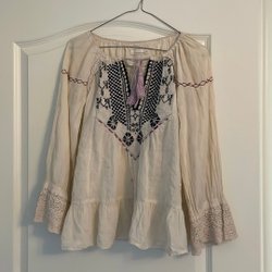 En vit Odd Molly blus med broderade detaljer och en spetskant. Blusen har en rund halsringning och korta ärmar. Den har en liten knappstängning i fram och är lätt och luftig. Storlek 1 motsvarar S men passar även en M