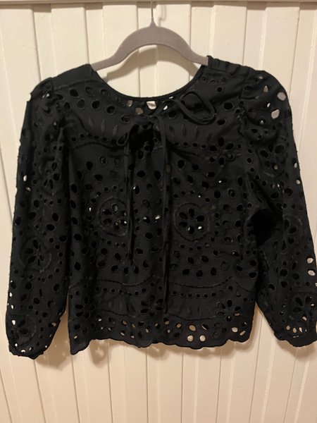 Svart blus med broderade detaljer och hålmönster. Blusen har lång ärm och knytband i halsen.