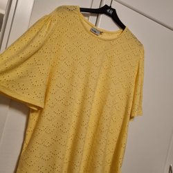 Skir blå blus med vita prickar och ränder. Blusen har långa ärmar och knäppning fram. Stor i storlek