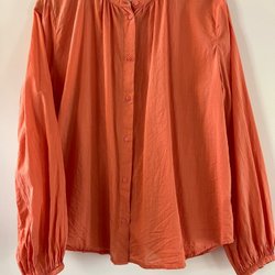 Orange blus med lång ärm och dekorativa knappar vid halsen. Blusen har resår nedtill,