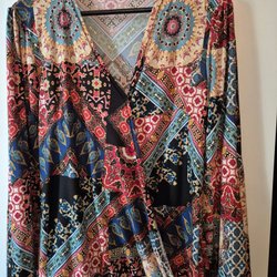 Färgglad långärmad blus med ett unikt mönster i nyanser av orange, blått och svart. Blusen har en avslappnad passform och en enkel knappdetalj vid halsen.