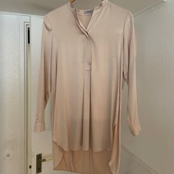 Rosa blus med V-ringning och trekvartsärmar. Blusen har en figurnära passform med rynkdetaljer i sidan. Observera att det finns en liten fläck på blusen och ett litet hål vid V-ringningen. Har djur i hemmet.
