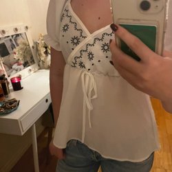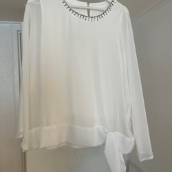 Vit långärmad blus med dekorativa detaljer. Blusen har en applikation av en vit blomma på vänster axel och ett broderat mönster som sträcker sig nedåt. Den högra sidan av blusen har ett draperat tyg med små strasstenar.