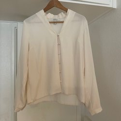 Ljusbeige, genomskinlig blus ( vero moda)med långa ärmar och knäppning framtill. Blusen har en avslappnad passform och en stilren krage med detaljer.