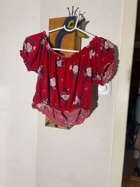 Röd blus med blommor och korta puffärmar. Blusen har resår upptill och nedtill.