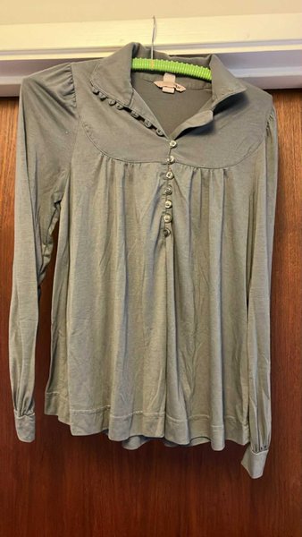 Khakifärgad blus med lång ärm, krage och knappar framtill.