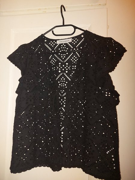 Svart blus med broderade detaljer och knytband framtill. Blusen har korta ärmar och en avslappnad passform.