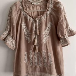 Skjorta Odd Molly st1, med långa ärmar. Blusen har en dekorativ broderad detalj längs framsidan och vid ärmsluten. Den har även en liten bröstficka och ett broderat mönster på ryggen.Viskose/Bomull.
