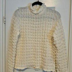 Snygg och unik off-shoulder topp med vågigt mönster. Toppen har långa, vida ärmar och en hög krage som knäpps med två knappar i nacken. Designen är asymmetrisk med en öppen axel. Toppen är i ett elegant och stilrent snitt.