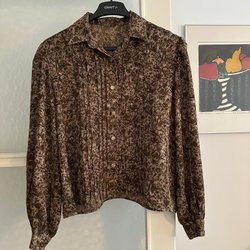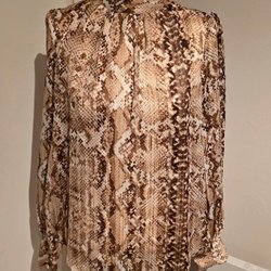 Brun ormskinnsmönstrad blus med lång ärm och smockdetaljer vid midja och ärmslut. Blusen har en liten öppning framtill som knyts med band.