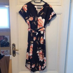 Ärmlös blus med blommigt mönster i svart. Blusen har en krage med volangdetaljer och knäpps framtill med knappar. Det finns även ett svart band som kan knytas i halsen. Oanvänd. Samfraktar gärna.