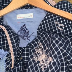 Odd Molly blus i storlek 2. Den är grön med vitt mönster. Den har knappar och lila spets i halsringningen. Den är i mycket fint begagnat skick och inte mycket använd.