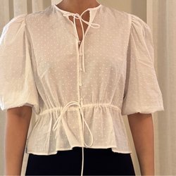 Vit blus med volangärmar. Blusen har en v-ringning och knyts i ryggen.