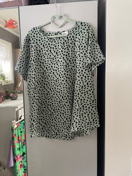 Grön blus med ett svart prickigt mönster. Blusen har korta ärmar och en rund halsringning.
