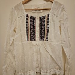 Vit blus med långa ärmar och detaljerad struktur. Blusen har en liten krage med volang och en knappslå framtill.
