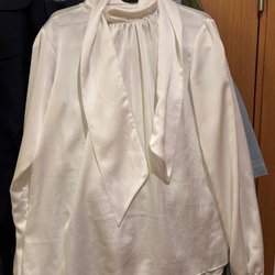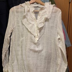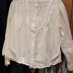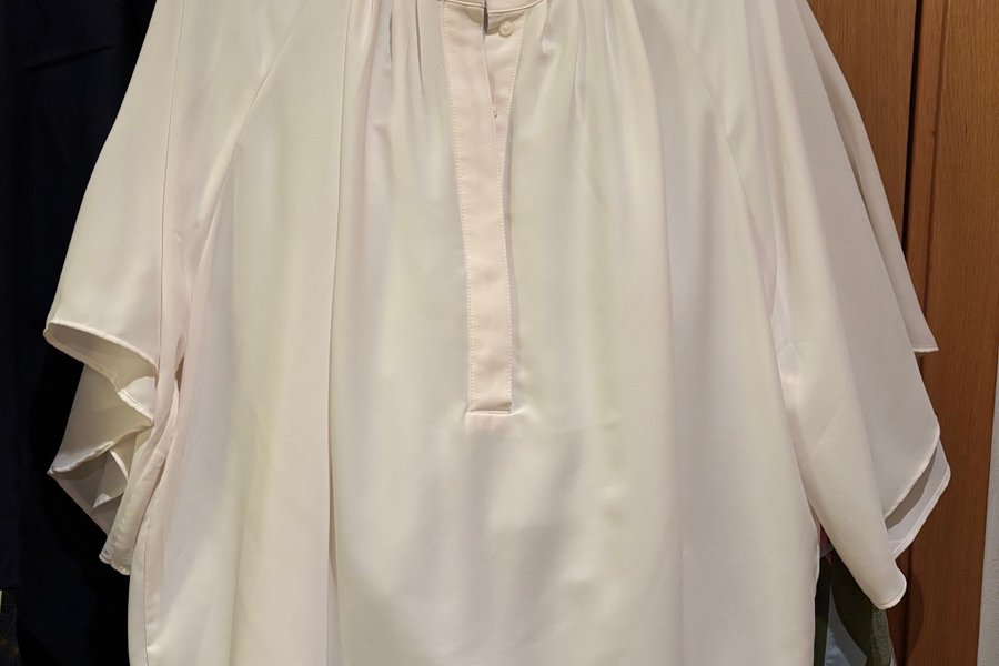 Ljusrosa blus med krage och knäppning framtill. Blusen har vida ärmar.