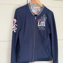 Ljus blus med ett mönster i form av ränder och små prickar. Blusen har långa ärmar och en v-ringning.