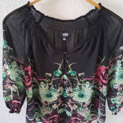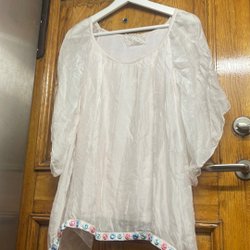 Ärmlös blus i en ljus färg med guldiga prickar. Blusen har en hög krage med volang och en nyckelhålsöppning i nacken. Den har en lös passform och en vågig design med flera lager. Från Holly&White. Ny och oanvänd. Storlek medium.