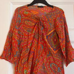 Färgglad blus med ett vackert paisleymönster i rosa, vitt och svart. Blusen har långa ärmar och en v-ringning.