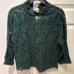 Vit spetsblus med långa ärmar och rund halsringning. Blusen har ett detaljerat spetsmönster över hela plagget och en knappstängning i nacken. Nederkanten och ärmsluten är vågiga.