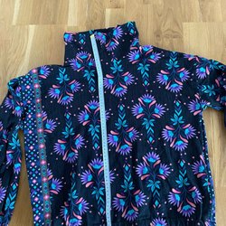 Blus med kort ärm och krage. Blusen har knappar framtill och ett mönster i blått och grönt. Passar bra till både vardags och fest. Den är märkt med medium men är liten i storleken. Bild 1 visar färgerna bäst.