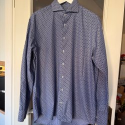 Object blå och vit mönstrad blus med långa ärmar. Blusen har en liten öppning framtill vid halsen och detaljer vid axlarna och ärmsluten.
