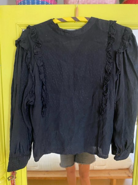 Svart blus med långa ärmar och volangdetaljer framtill. Blusen har en rund halsringning med knappar baktill och vid ärmslut.