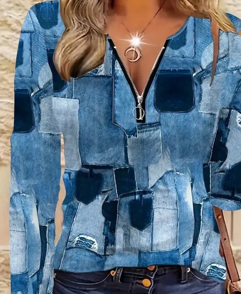 Snygg och trendig långärmad blus med dragkedja fram. Blusen har ett unikt mönster som ser ut som en denimlapptäcke. Designen är modern och passar perfekt för både vardag och festligare tillfällen. Blusen har en avslappnad passform och är bekväm att bära.