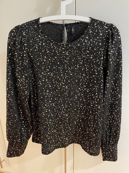 Svart långärmad blus med ett mönster i guld. Blusen har en rund halsringning och en liten öppning med knapp i nacken. Stl S, mycket bra skick.