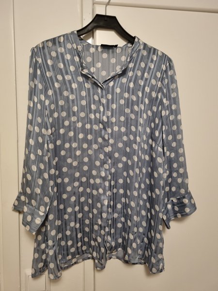 Skir blå blus med vita prickar och ränder. Blusen har långa ärmar och knäppning fram. Stor i storlek