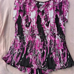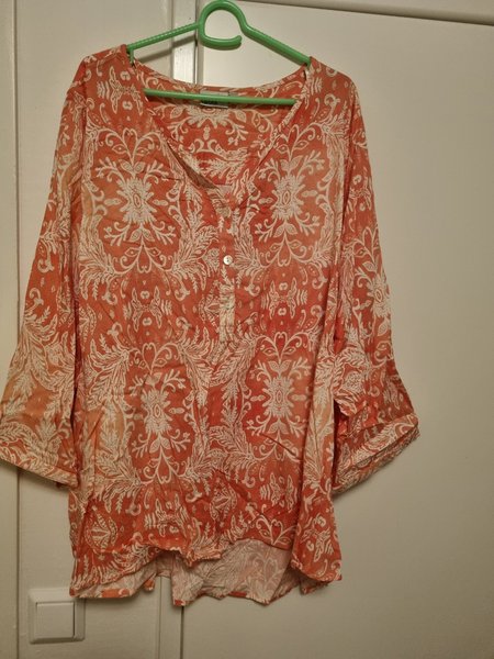 Rosa och vit blus med ett blommigt mönster, trekvartsärmar och knappar framtill. Använd en gång. Det står märkt S i men är felmärkt.