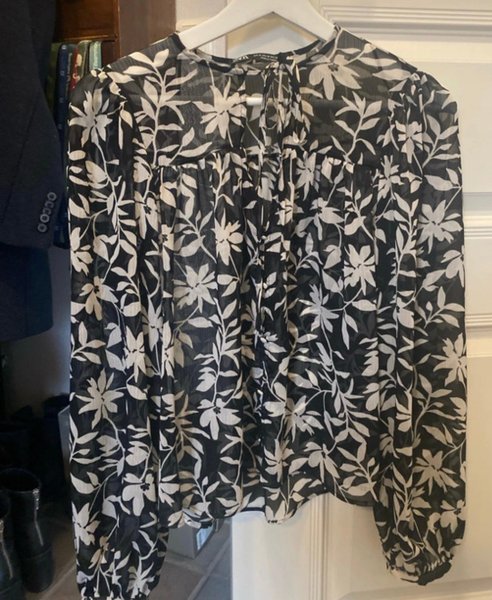 Svart och vit blus med långa ärmar och ett blommigt mönster. Blusen har en avslappnad passform och en knytning i halsen. St: M