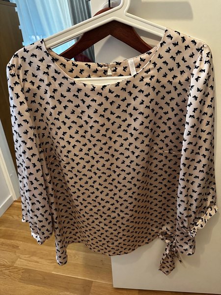Långärmad blus med ett mönster av svarta fjärilar. Blusen har en rund halsringning och knytband i nederkanten på ena sidan.