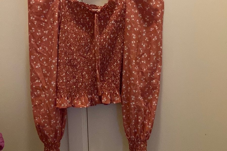 Långärmad blus med smock och blommor. Blusen har en fyrkantig halsringning och resår vid ärmslut.