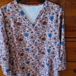 Bluse med 3/4 lange ærmer og et farverigt mønster. Blusen har en V-udskæring med knapper og et detaljeret mønster på ærmekanterne.