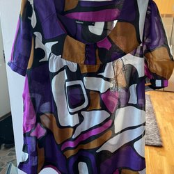 Lila och vit blus med blommigt mönster. Den har en v-ringning och korta ärmar. Blusen har en avslappnad passform.
