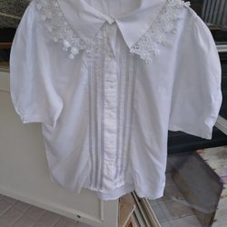 Vit kortärmad blus med krage och dekorativa detaljer på ärmarna. Blusen har en liten öppning baktill.