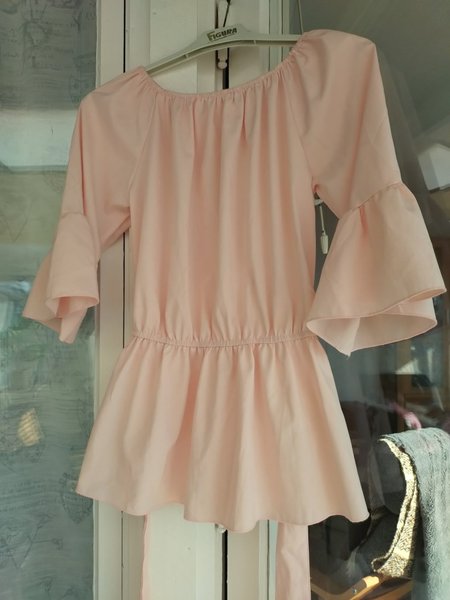 Ljusrosa topp med elastisk ringning och midja. Toppen har utsvängda ärmar.