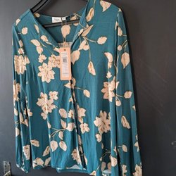 Elegant, tunn crèmefärgad blus med trumpetärm och dekorativa knappar vid axlarna från Saint Tropez. Blusen har en mjuk textur och ett fint fall. Blusen är endast använd en gång. Den är upplagd, då den var längre baktill från början. Tvättrådslappen är bortklippt, då den var skrymmande, men blusen tvättas i 30 grader.